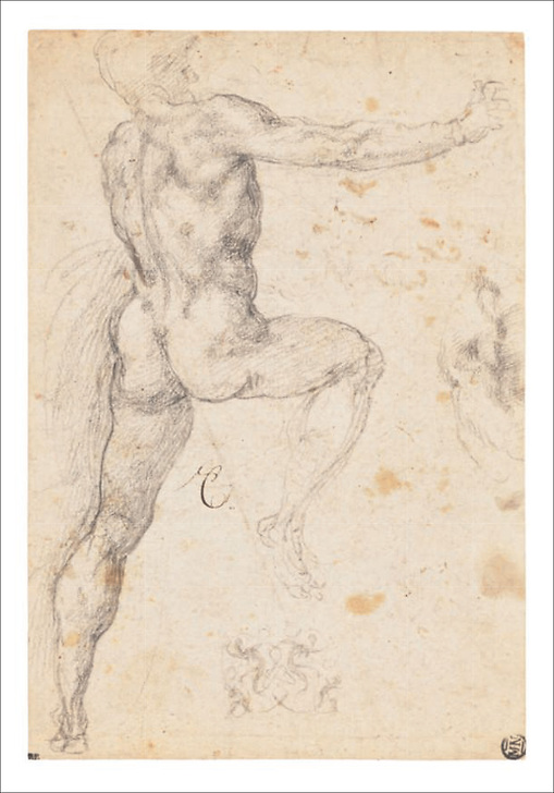 Postcard Michelangelo - Nude man, seen from behind, leaping to the right; detail of the right shoulder; decorative motif, c. 1530