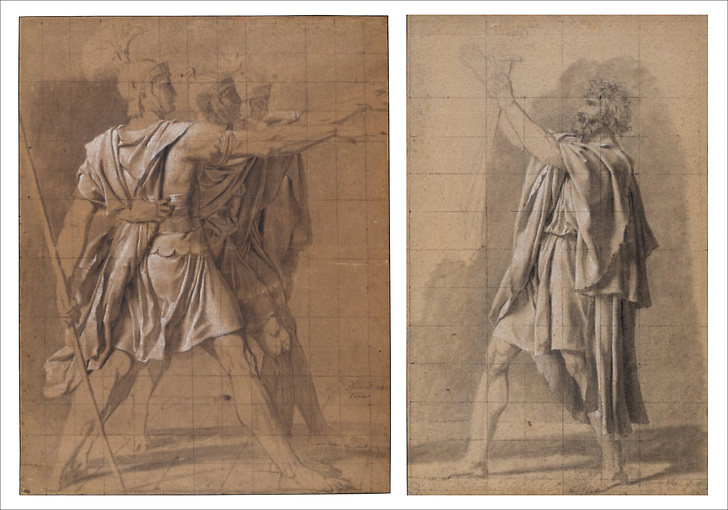 Carte postale Jacques-Louis David - Les Trois Horaces, étude pour Le Serment des Horaces, vers 1784 et Figure du vieil Horace, étude pour Le Serment des Horaces, vers 1784