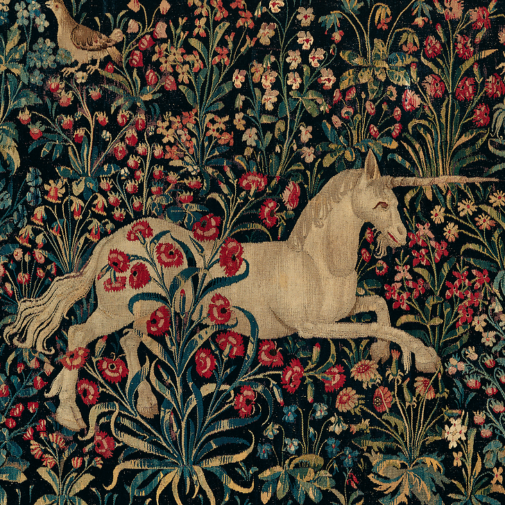 Carte postale Millefleur : licorne et cerf affrontés, (détail), vers 1500.